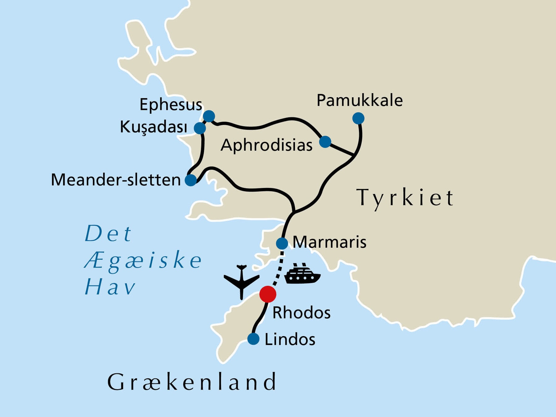 Efter en nat på stjernehotel på Rhodos, nyder vi en fantastisk panorama-overfart i en moderne katamaran. Marmaris og det fortryllende Tyrkiske Ægæiske byder os velkommen med sine vidunderlige øer, skove og bugter. Vi kører forbi smukke landskaber over Taurusbjergene og videre til Pamukkale. Kalkstensterrasserne blev dannet gennem tusinder af år af kalkholdige termiske kilder og er i dag en helt særlig attraktion. Her gør vi et fotostop ved de imponerende kalkstensterrasser, som blev erklæret for UNESCO-verdensarv i 1988. Vi overnatter på vores smukke termiske hotel i Pamukkale.